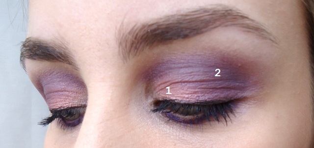 Sombras Battement (1) e Bustier (2) da Aromaleigh da colecção Moulin Rouge, sobre a sombra em creme da Guerlain Ombre Fusion na cor Bahia, no lacrimal e por baixo da sobrancelha a cor mais clara do quarteto de sombras da Benecos combinados com um risco violeta na pálpebra inferior (Flashy Liner Ultra Violet - Sephora).