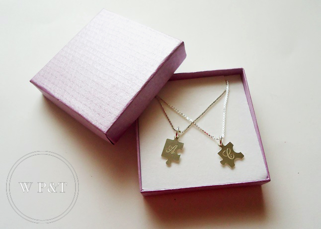 Pedi um "Friend Necklace", ou seja, dois colares com um pendente em forma de puzzle, um para mim outro para a minha irmã. As peças no site parecem maiores e robustas, em mão as peças são pequeninas, finas e delicadas. Estes colares são em prata e custam £30 (o par).